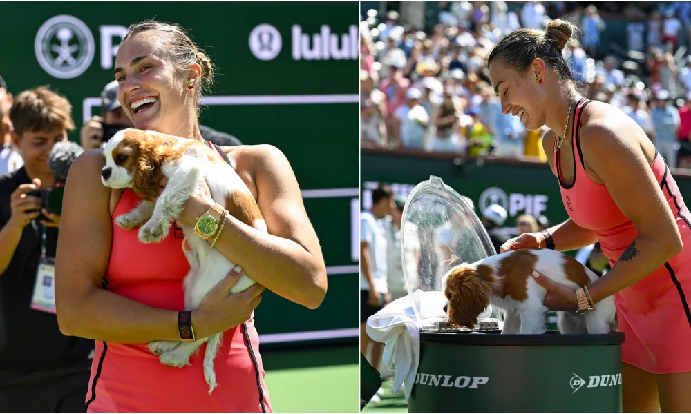 Sabalenka saved a championship point to win Indian Wells, then cooled puppy Ash courtside. Photo op.