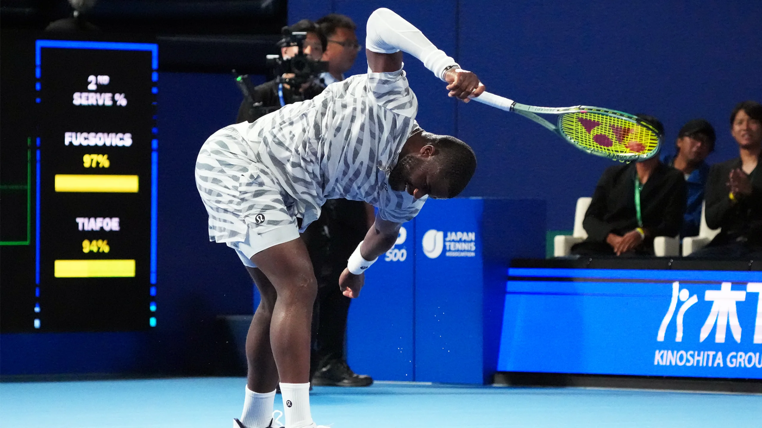 Tiafoe lost in the Japan Open first round to qualifier Marton Fucsovics, then smashed his racket….