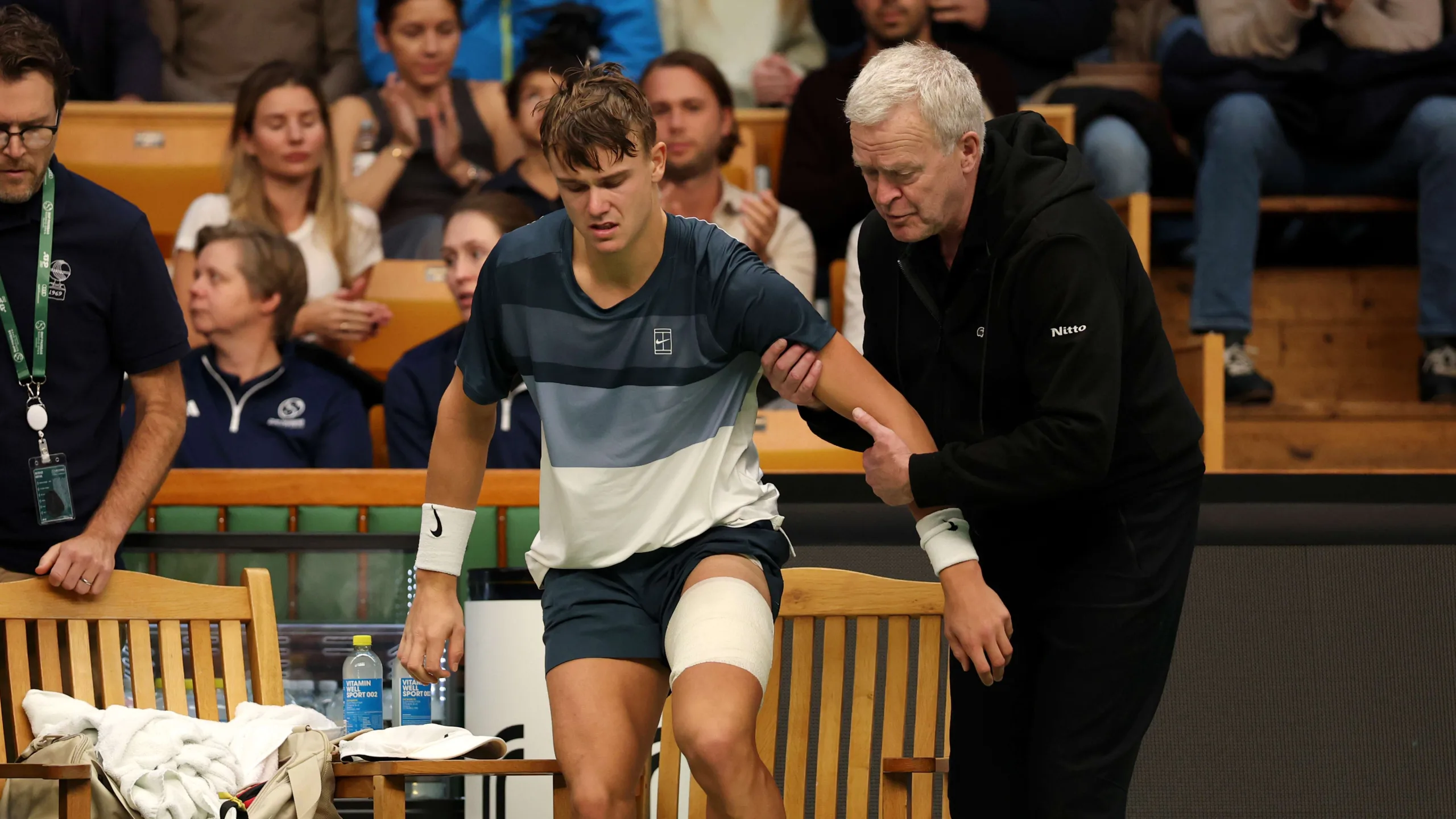 Rune arrived on court with his left leg wrapped and was leading 6-4, 2-2 when he pulled up following a forehand in the deuce court while holding break point. He limped to his player bench and began tearing up as an ATP physio consulted. The match ended shortly thereafter when Rune retired.