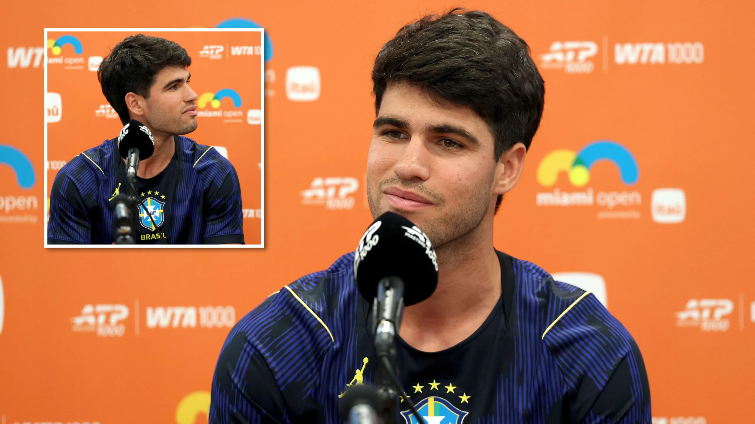 Alcaraz wore Brazil’s new away jersey at Miami Open media day, stirring social media and smiles. ok