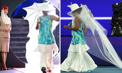 Naomi Osaka arrived at Rod Laver Arena in a seafoam Nike dress, hat, parasol and pleated pants in Oz